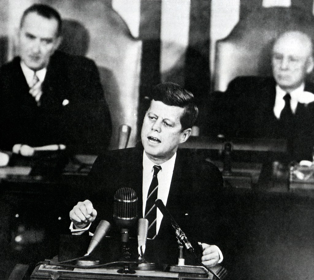 Speaking to Congrss and The Nation, President Kennedy said on May 25, 1961; “I Believe th at this Nation should commit Itself to Achieving the Goal, Before This Decade Is Out, Of Landing a man on tne Moon and returning him Safely to Earth,”(MIX FILE)courtesy of NASA